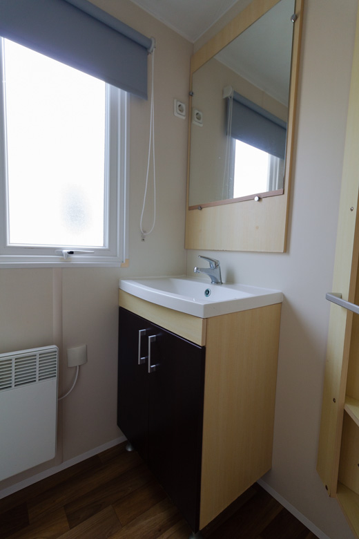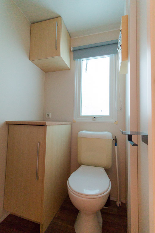 Mobil Home IRM Mod. Apollon de 42.8m2. Bonita casa con amplio salón con cocina integrada en el mismo espacio. Dispone de un dormito doble y dos dormitorios individuales con dos camas pequeñas. Baño completo.
