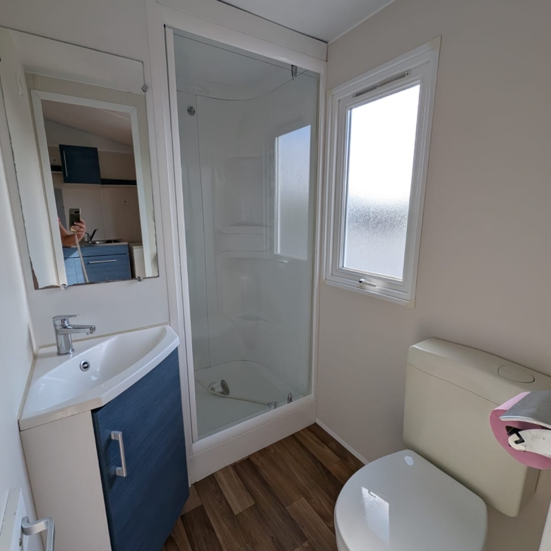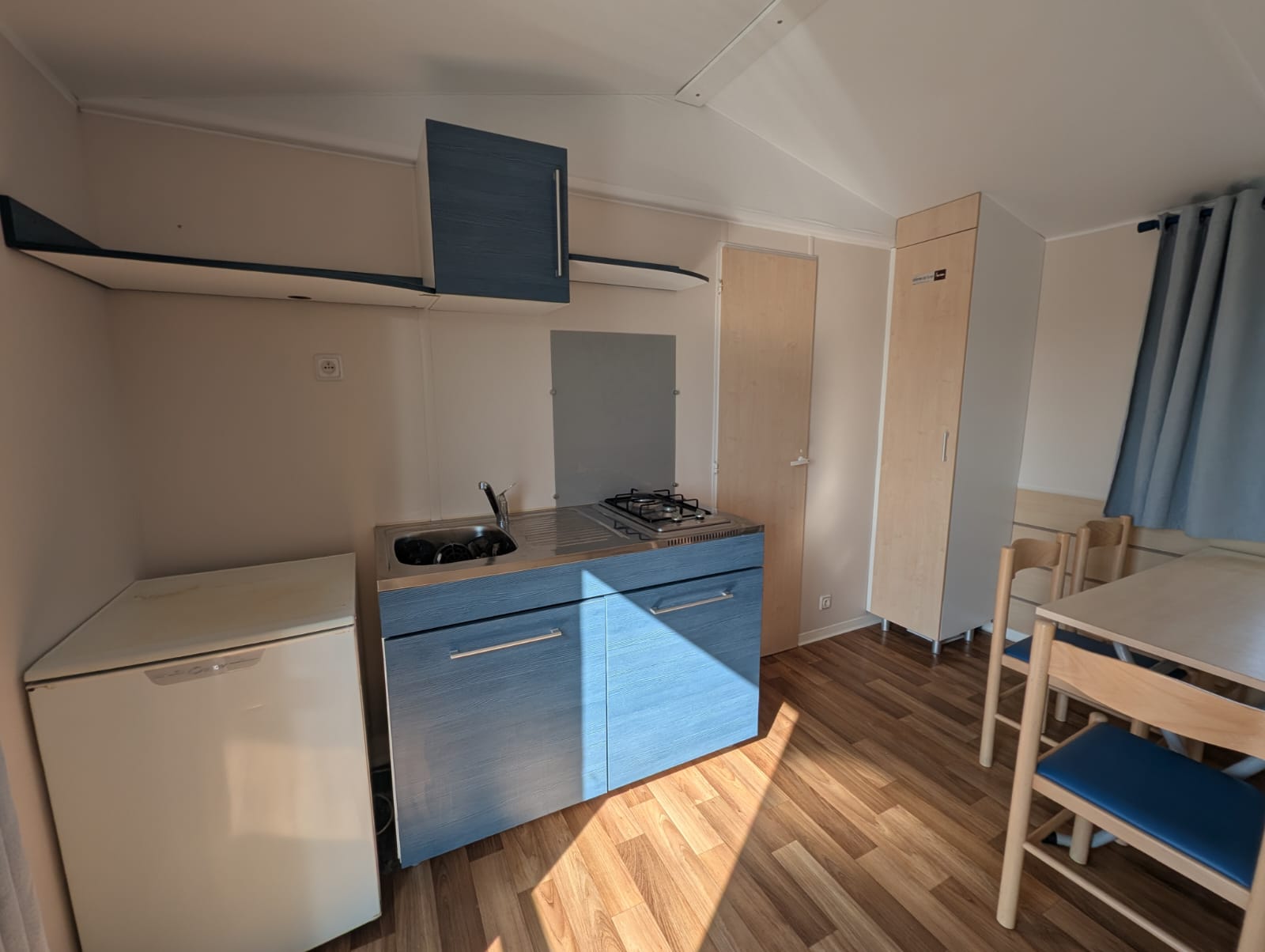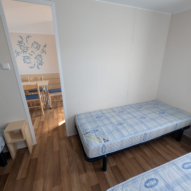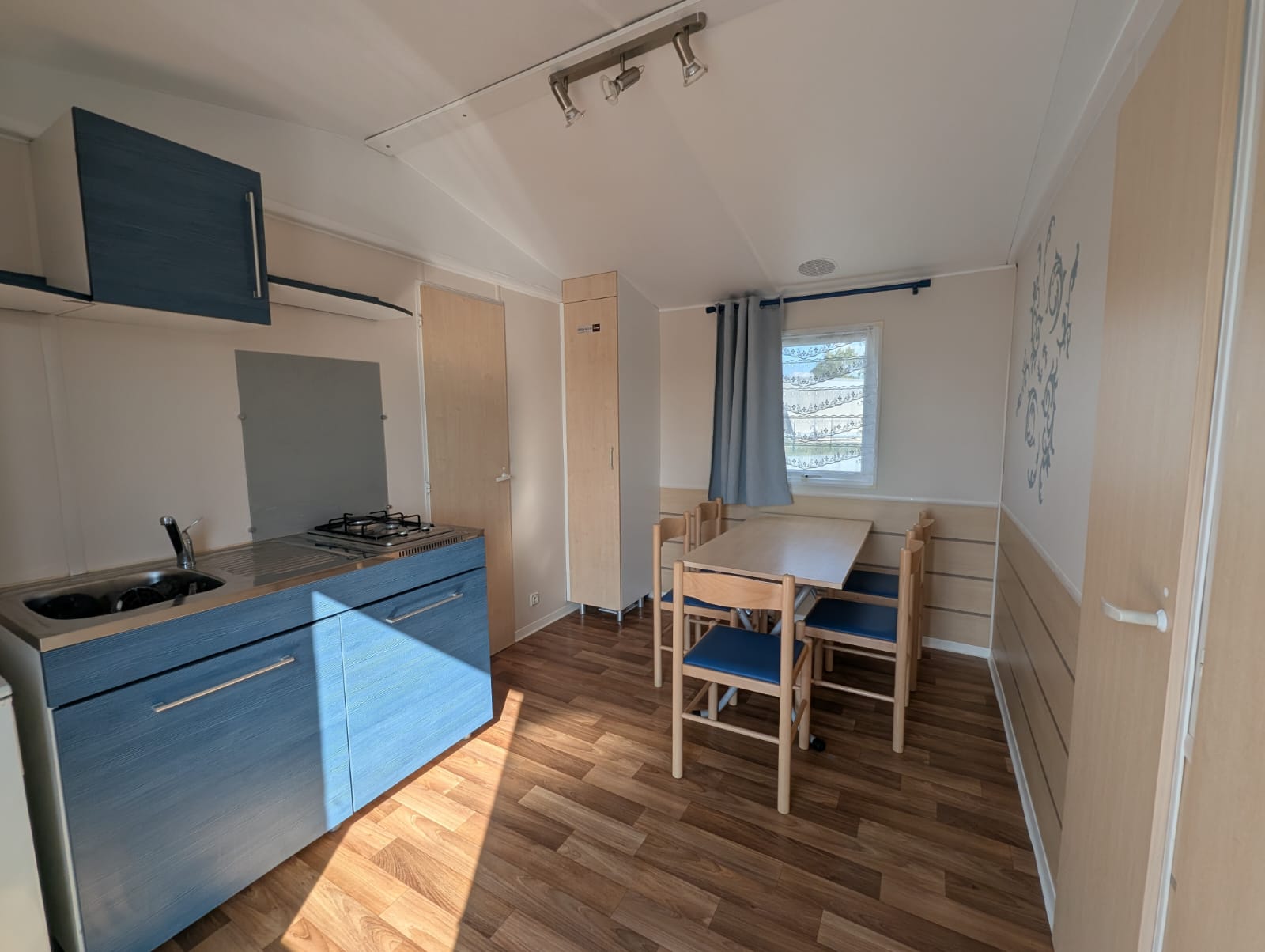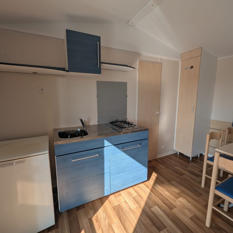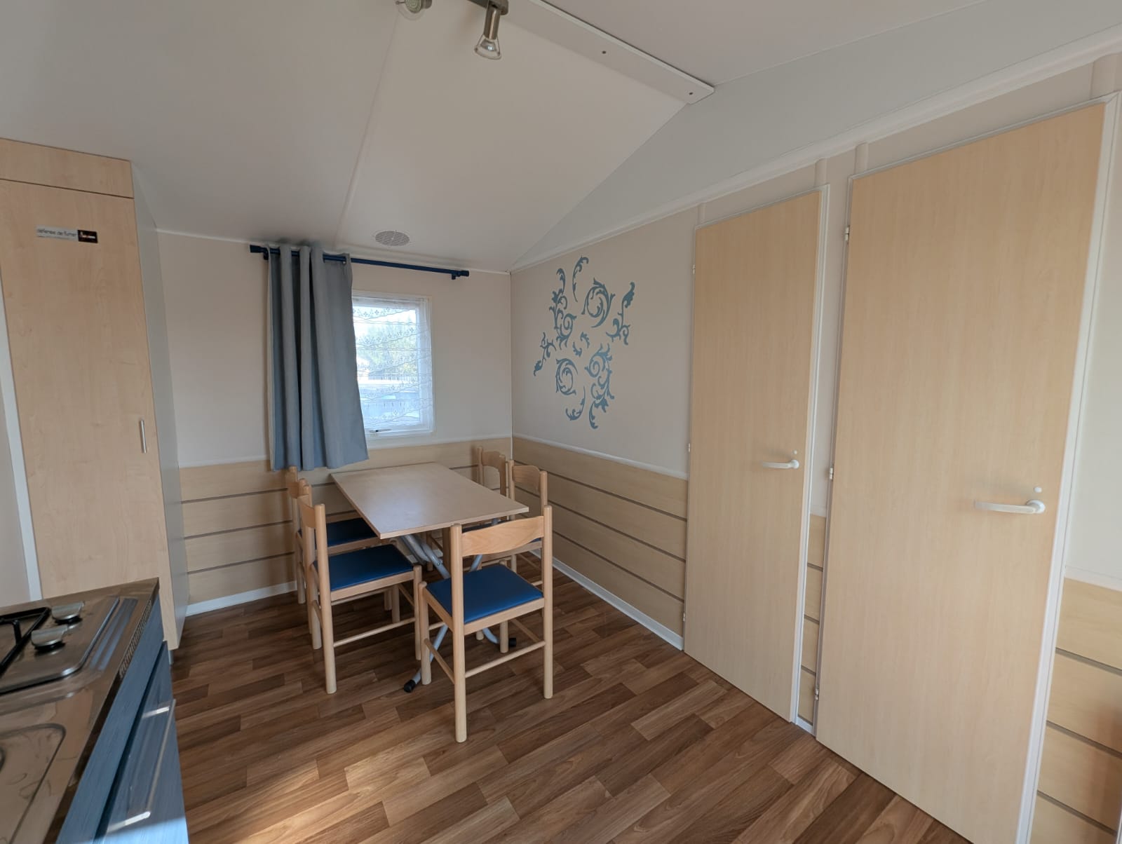Práctica mobil home residencial marca IRM, modelo Domino, con unas dimensiones de 6,70 x 4 m. Su diseño compacto aprovecha cada metro cuadrado para ofrecer estancias cómodas y bien distribuidas.