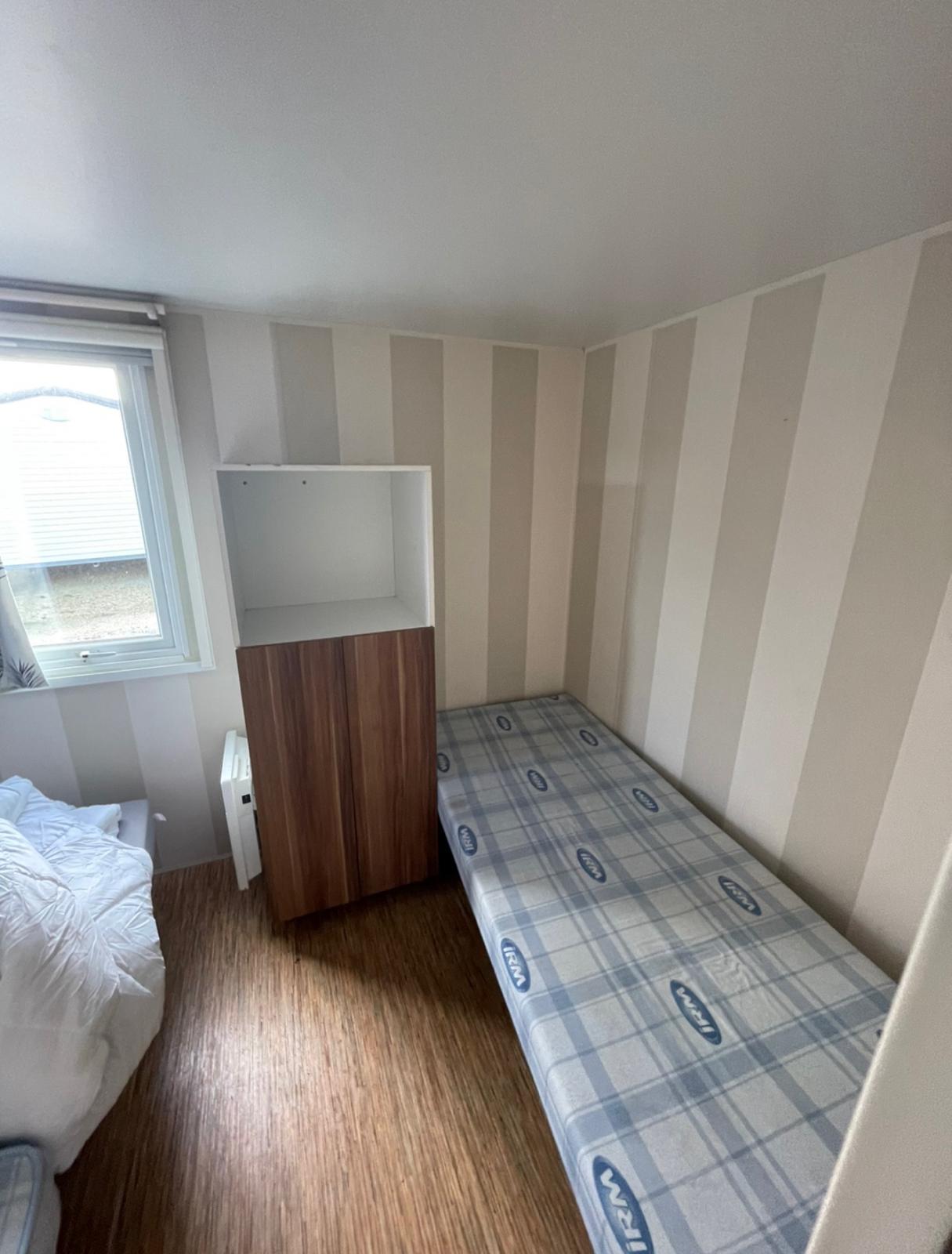 • El segundo dormitorio, equipado con cama de matrimonio y armario para almacenamiento.