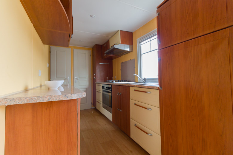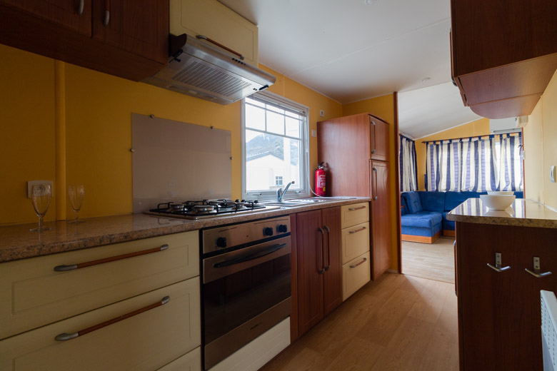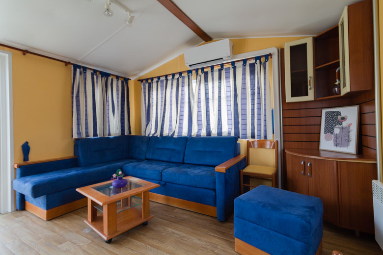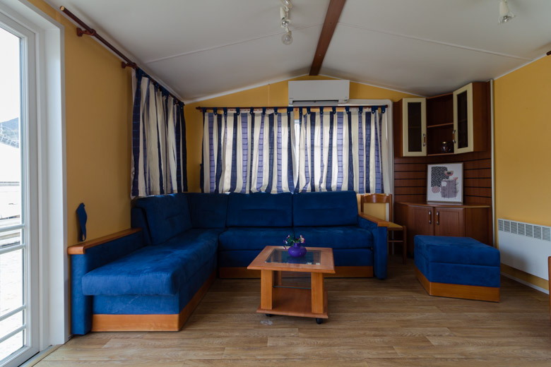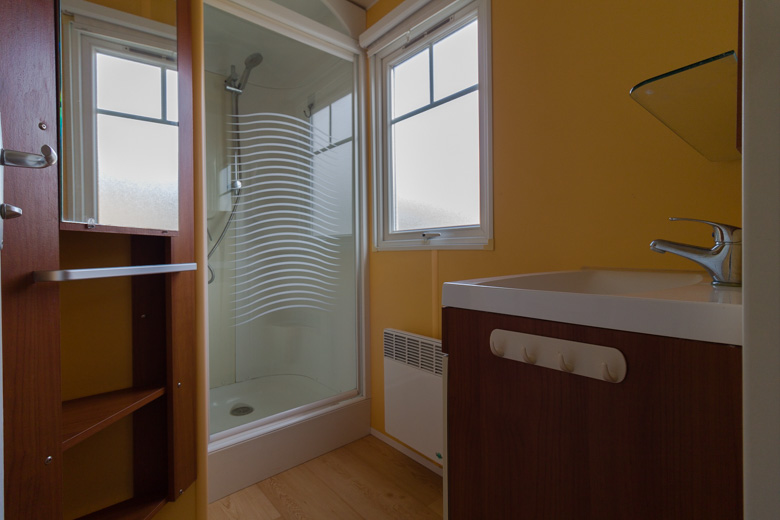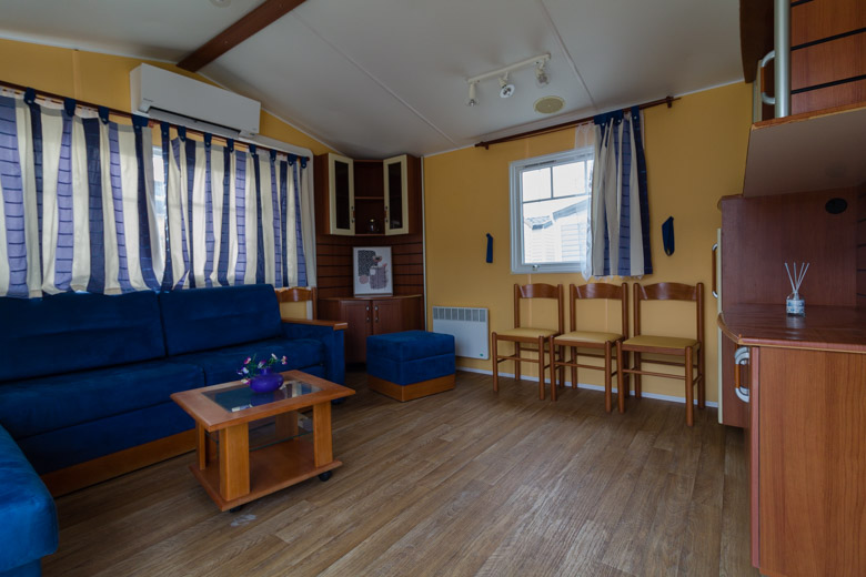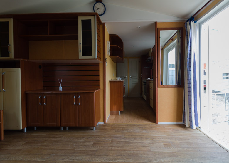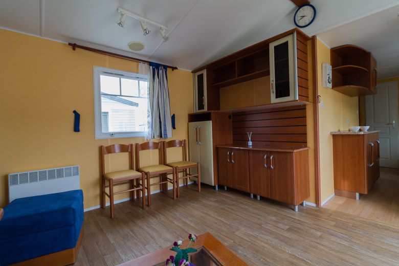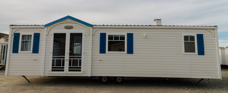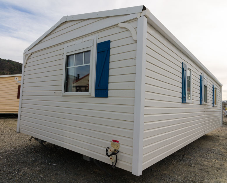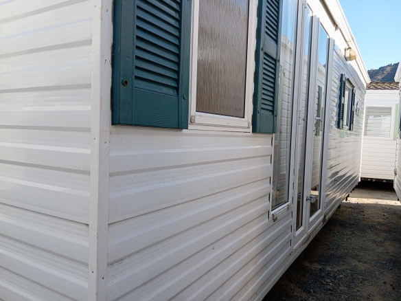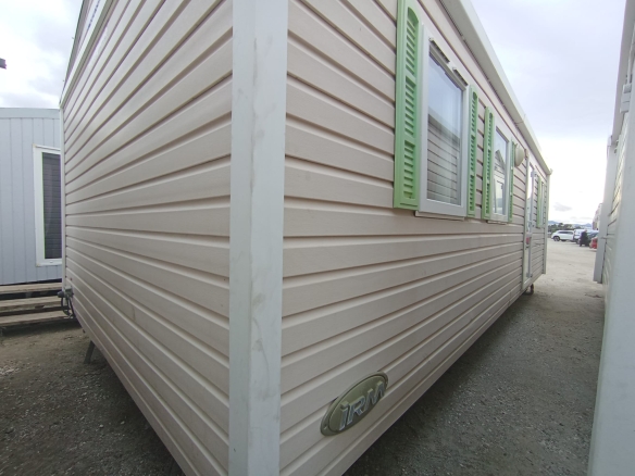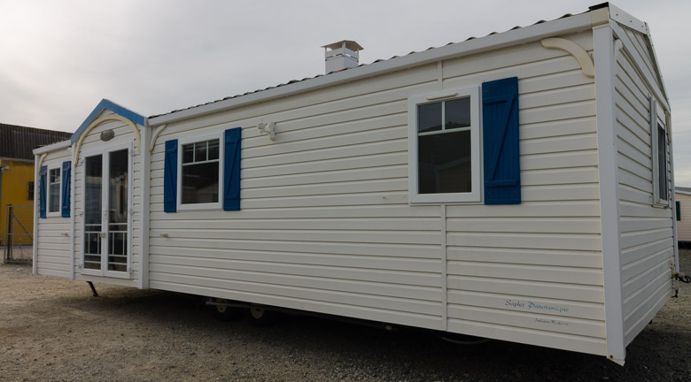 Amplia mobil home residencial marca IRM, modelo Saphir Panoramique, con una superficie de 36.8m². Su diseño moderno destaca por su gran ventana panorámica, que llena el interior de luz natural y potencia la sensación de amplitud.