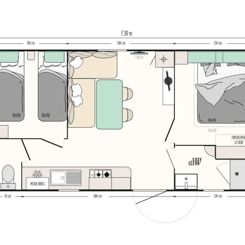 Acogedora mobil home marca IRM, modelo Super Mercure, con una superficie de 29,2 m². Su distribución práctica aprovecha cada metro para ofrecer comodidad y funcionalidad en un formato compacto.