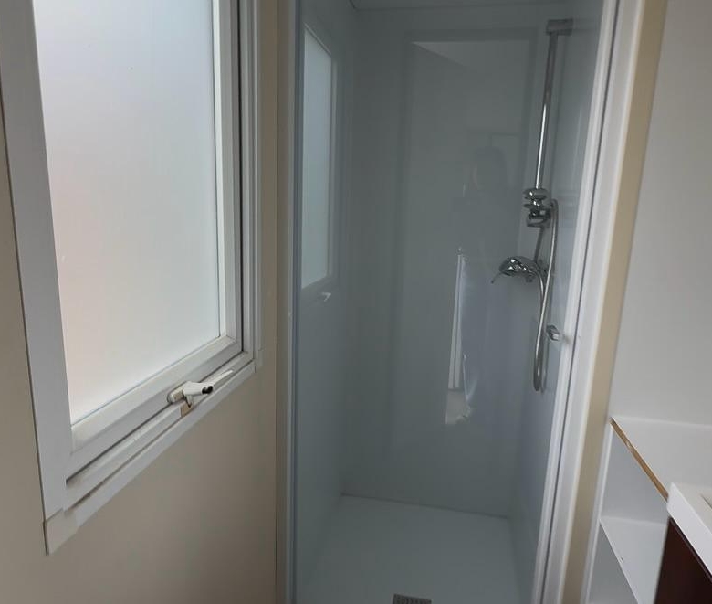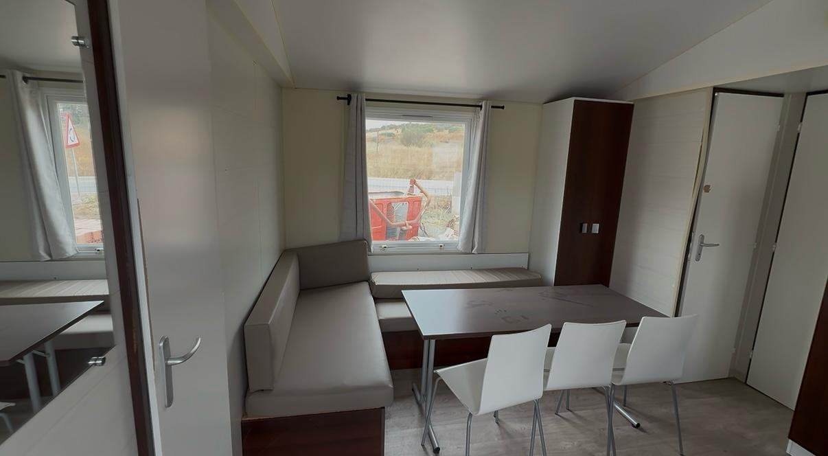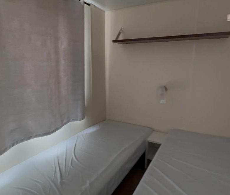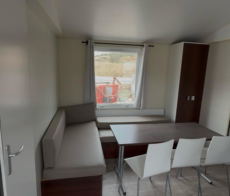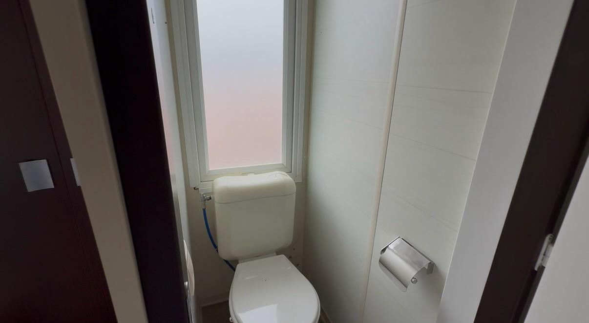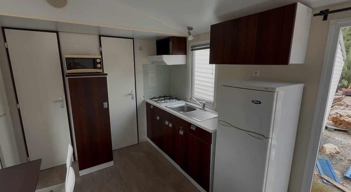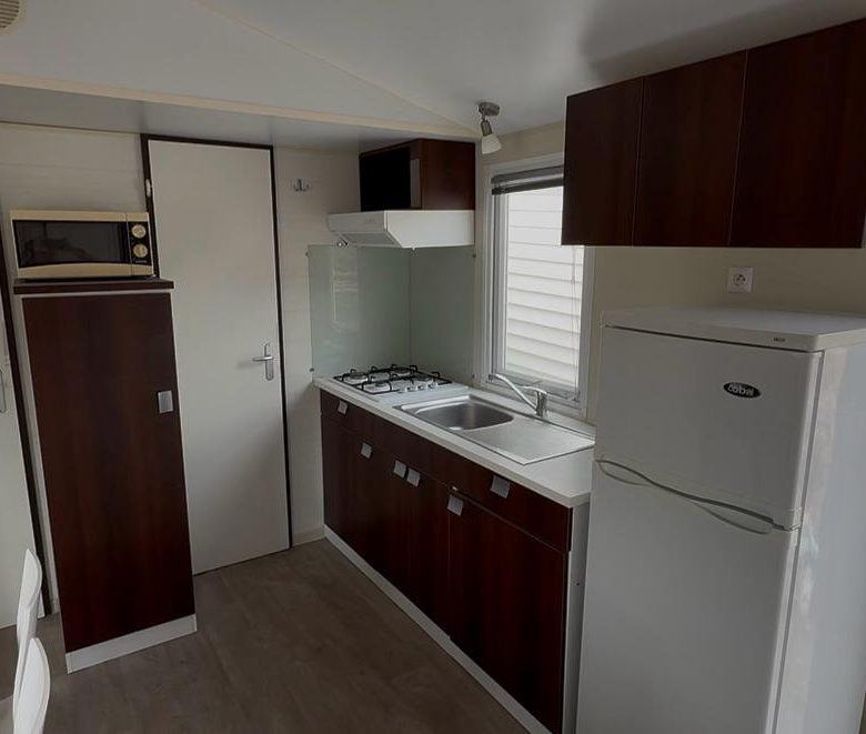 Mobil home Ohara de 31,2m2. Consta de salón/comedor, cocina, 3 dormitorios y baño al estilo francés (2 dependencias). Techo a dos aguas. Puertas y ventanas de doble cristal . Cocina equipada con nevera grande, campana , hornilla de gas y microondas. Dispone de una cama de matrimonio en el dormitorio principal y de dos camas individuales en cada uno de los otros dos dormitorios. Interior moderno en madera vengué.