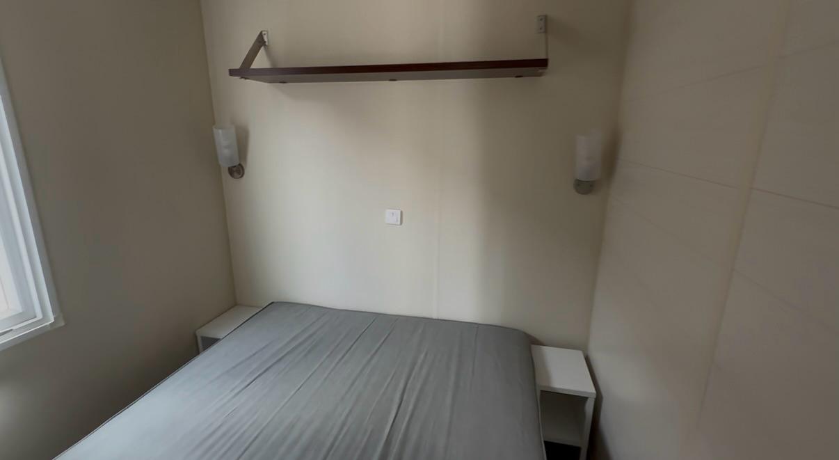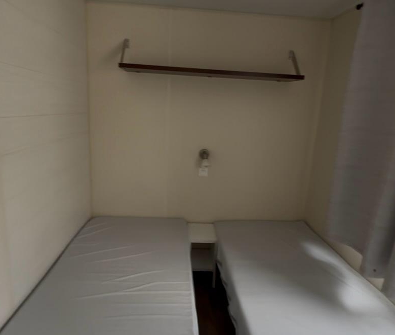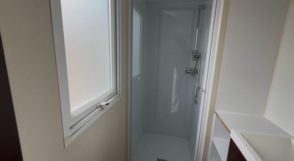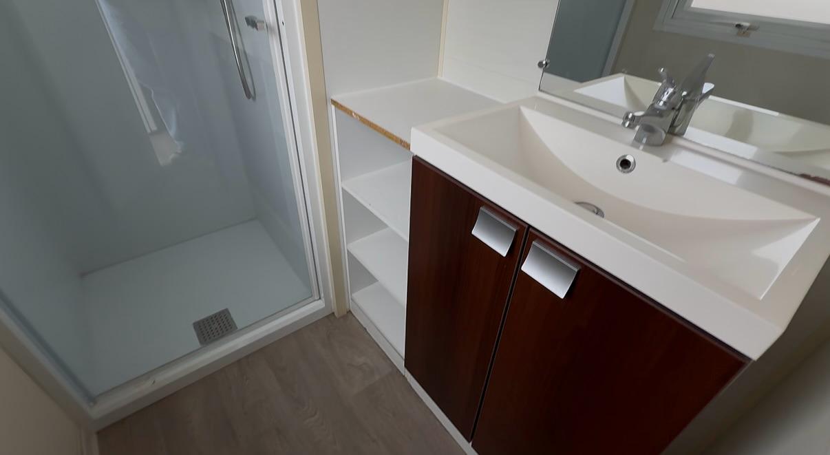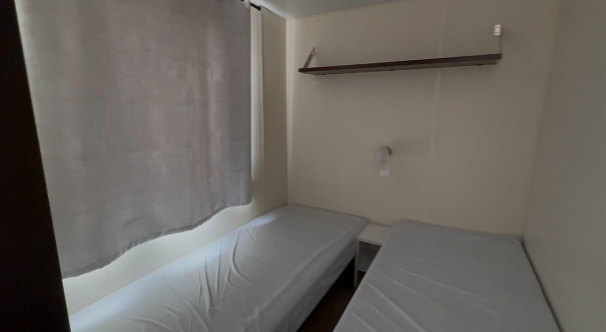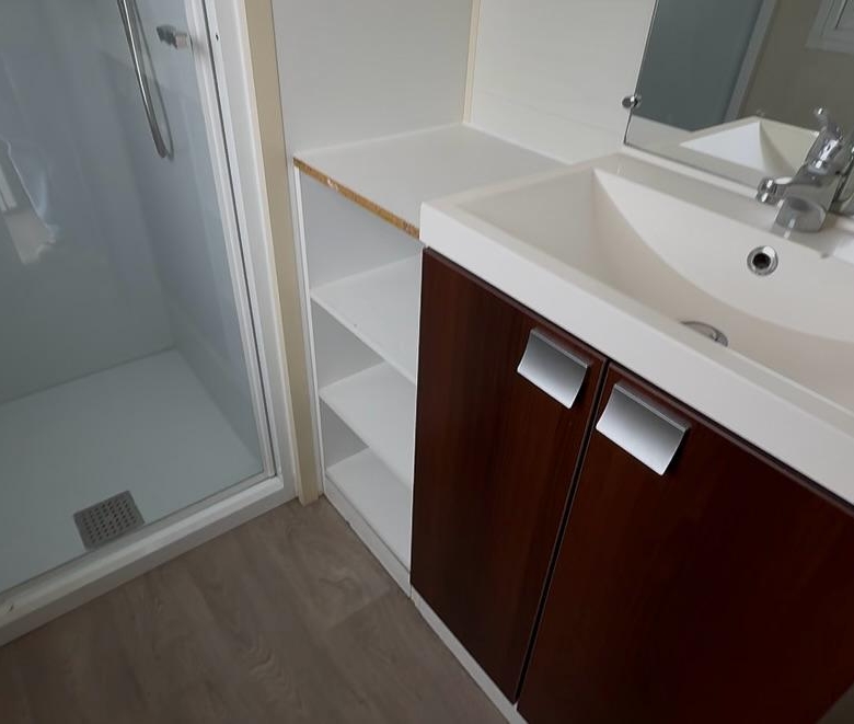 Mobil home Ohara de 31,2m2. Consta de salón/comedor, cocina, 3 dormitorios y baño al estilo francés (2 dependencias). Techo a dos aguas. Puertas y ventanas de doble cristal . Cocina equipada con nevera grande, campana , hornilla de gas y microondas. Dispone de una cama de matrimonio en el dormitorio principal y de dos camas individuales en cada uno de los otros dos dormitorios. Interior moderno en madera vengué.