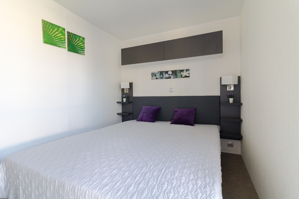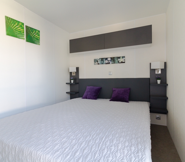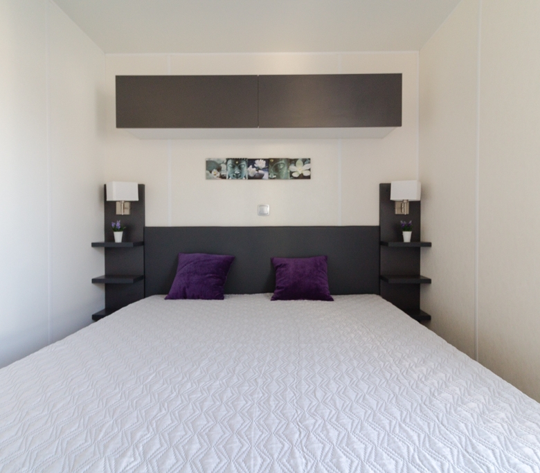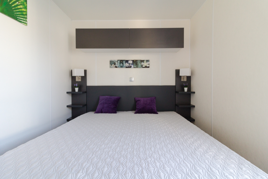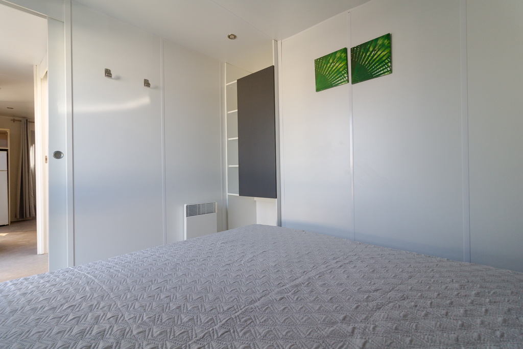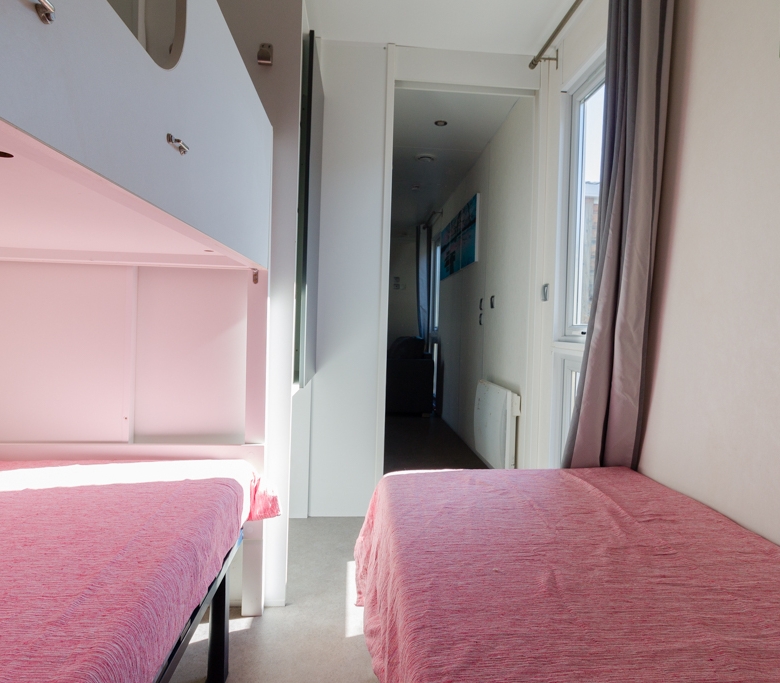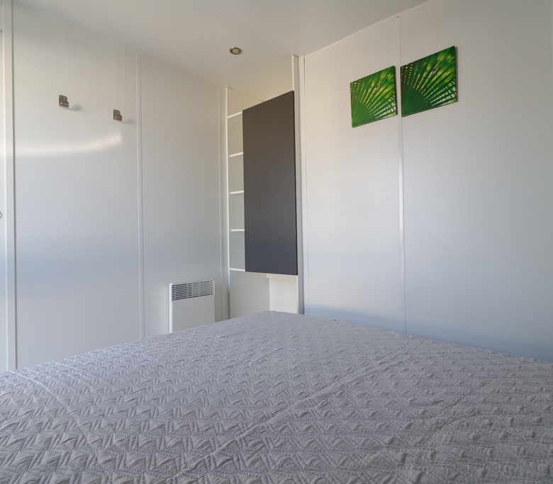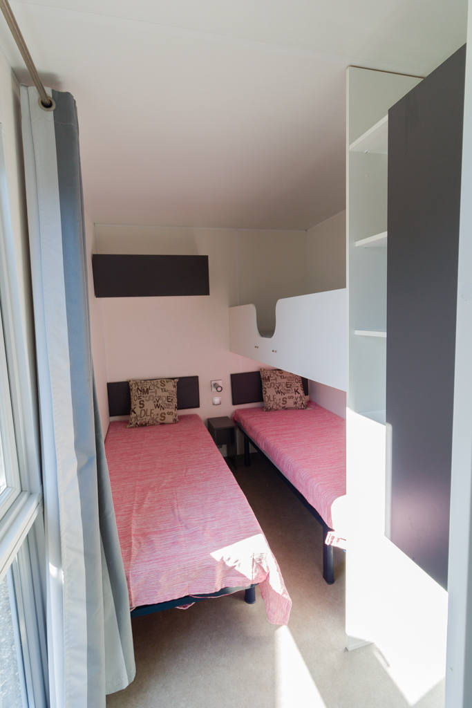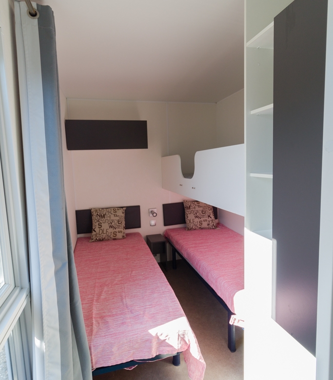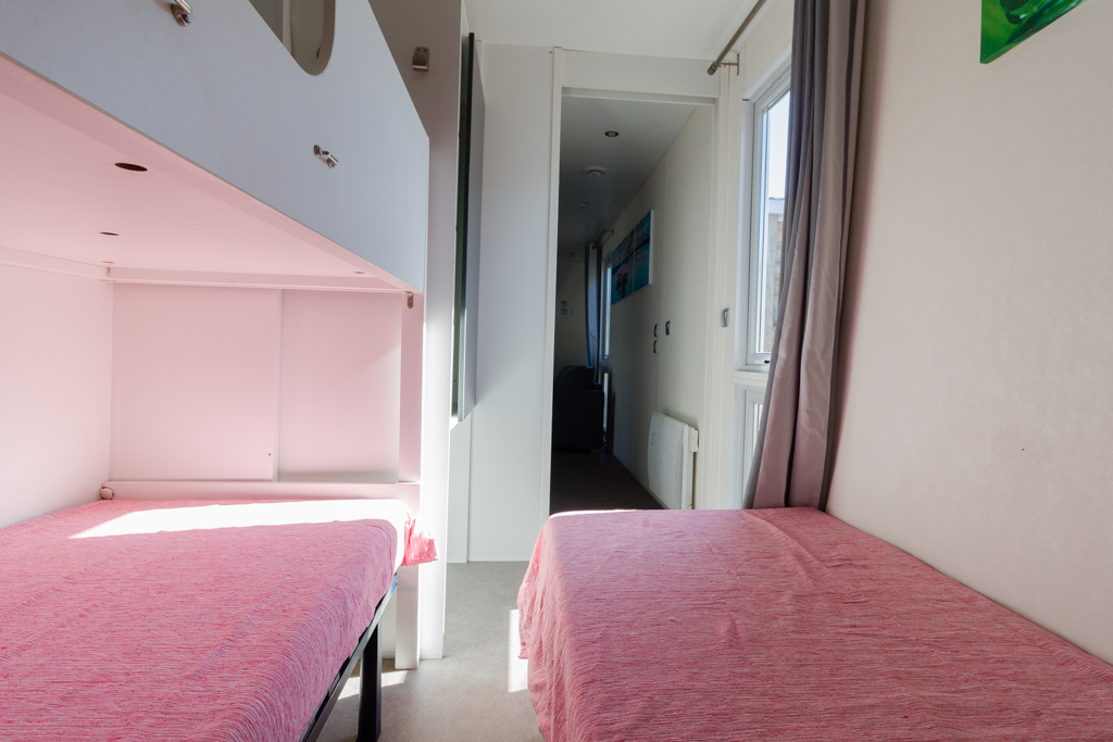 En la zona de descanso, el dormitorio principal incluye cama de matrimonio y armario empotrado. El dormitorio individual cuenta con tres camas y armario, adaptándose a las necesidades de familia o invitados.