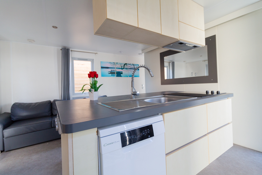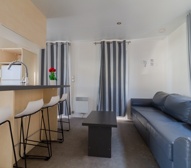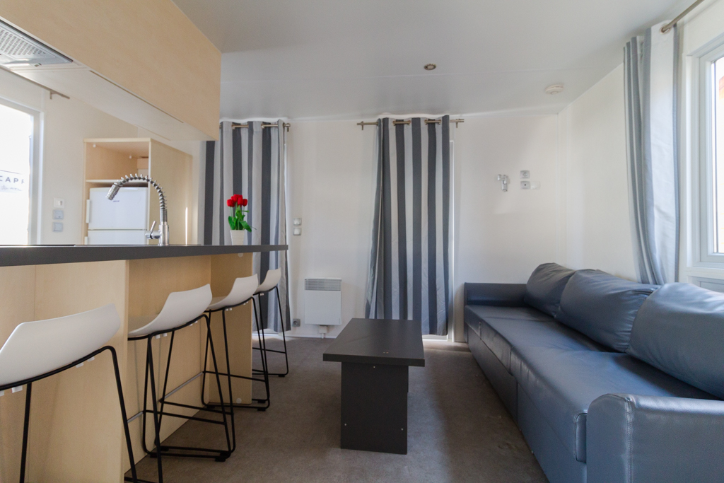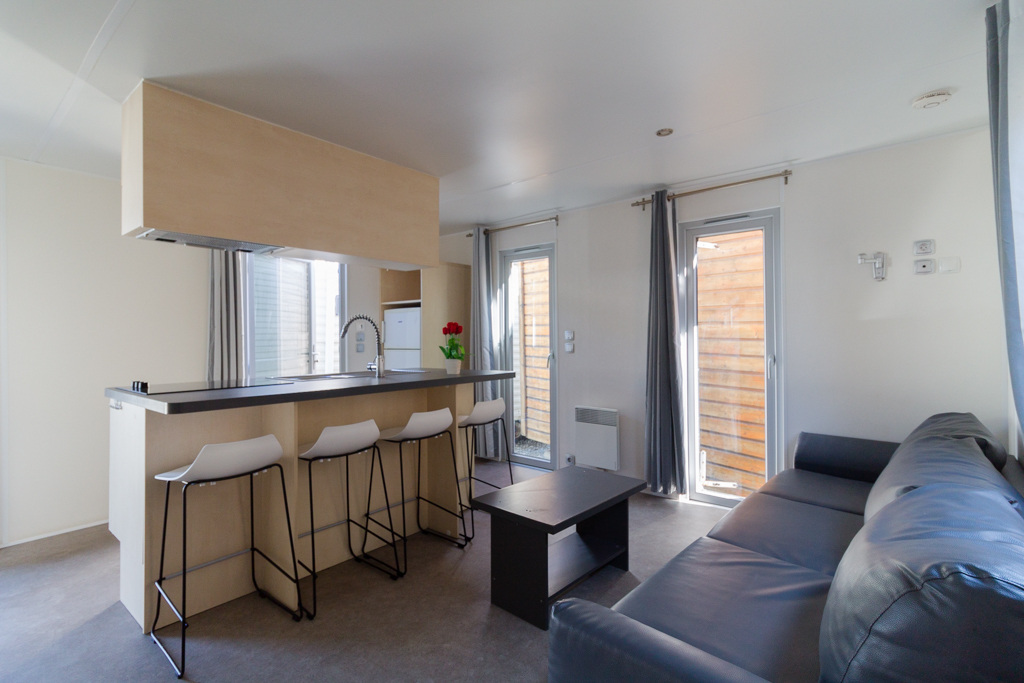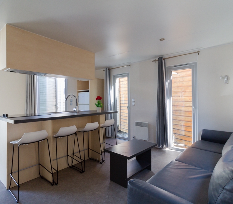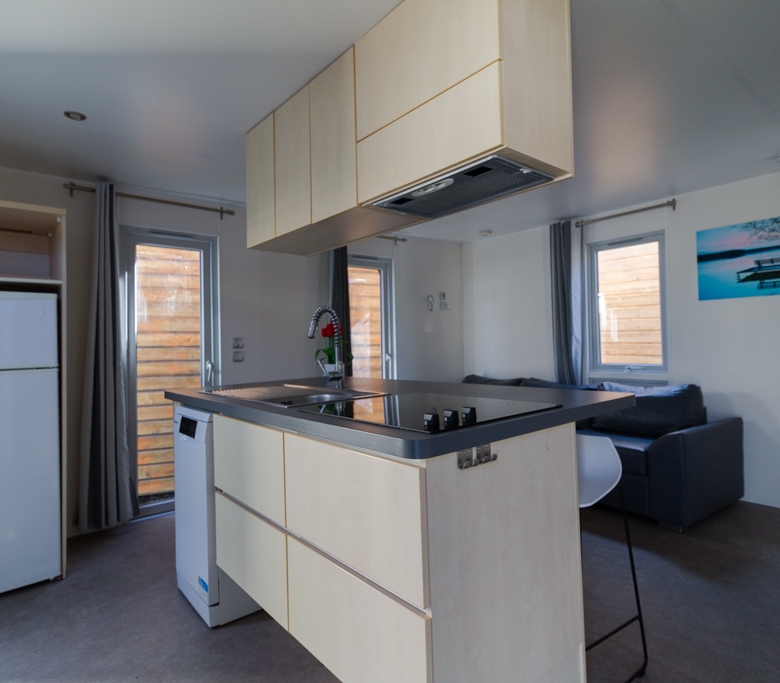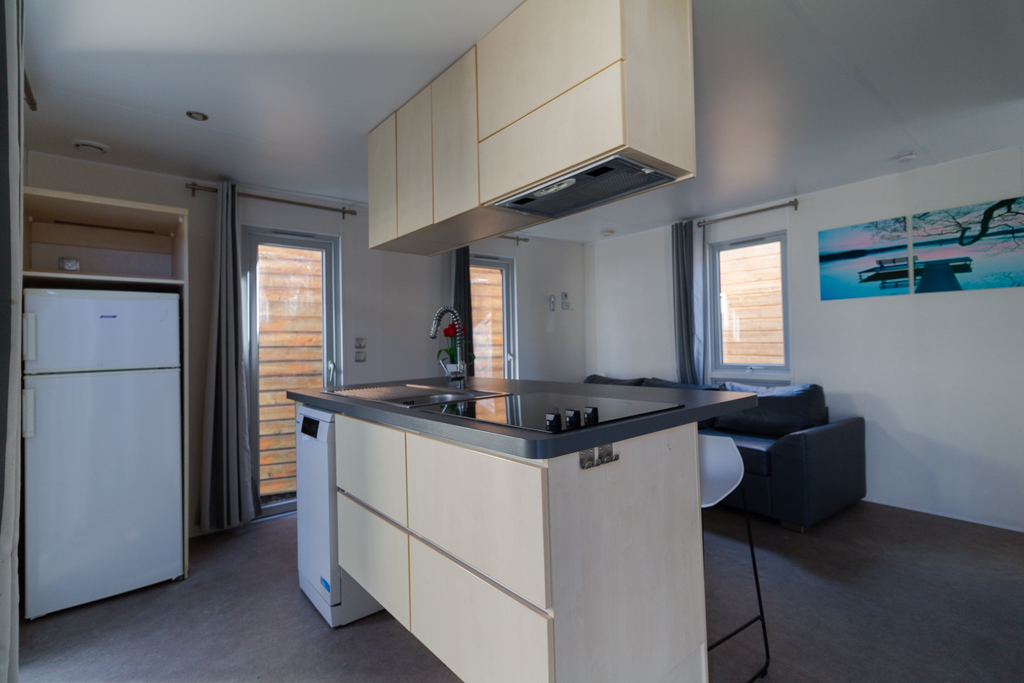 Moderna mobil home residencial Ohara, modelo Key West, con una superficie de 35.2m2. Su diseño en forma de cubo y el acabado exterior en madera le otorgan una estética actual y diferenciada, ideal para quienes buscan una vivienda con estilo contemporáneo.