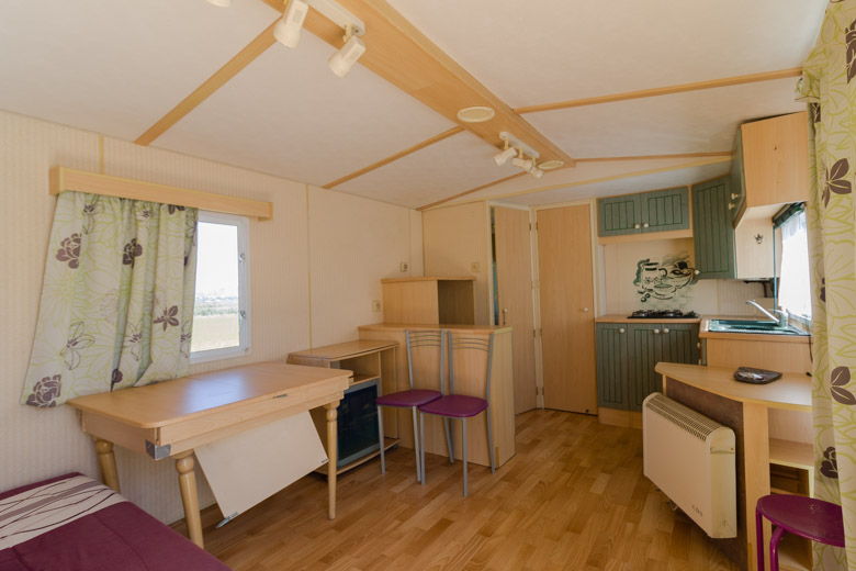Se distribuye en salón comedor con cocina equipada, dormitorio principal con cama de matrimonio y armario empotrado, dormitorio individual con dos camas pequeñas y armario empotrado.